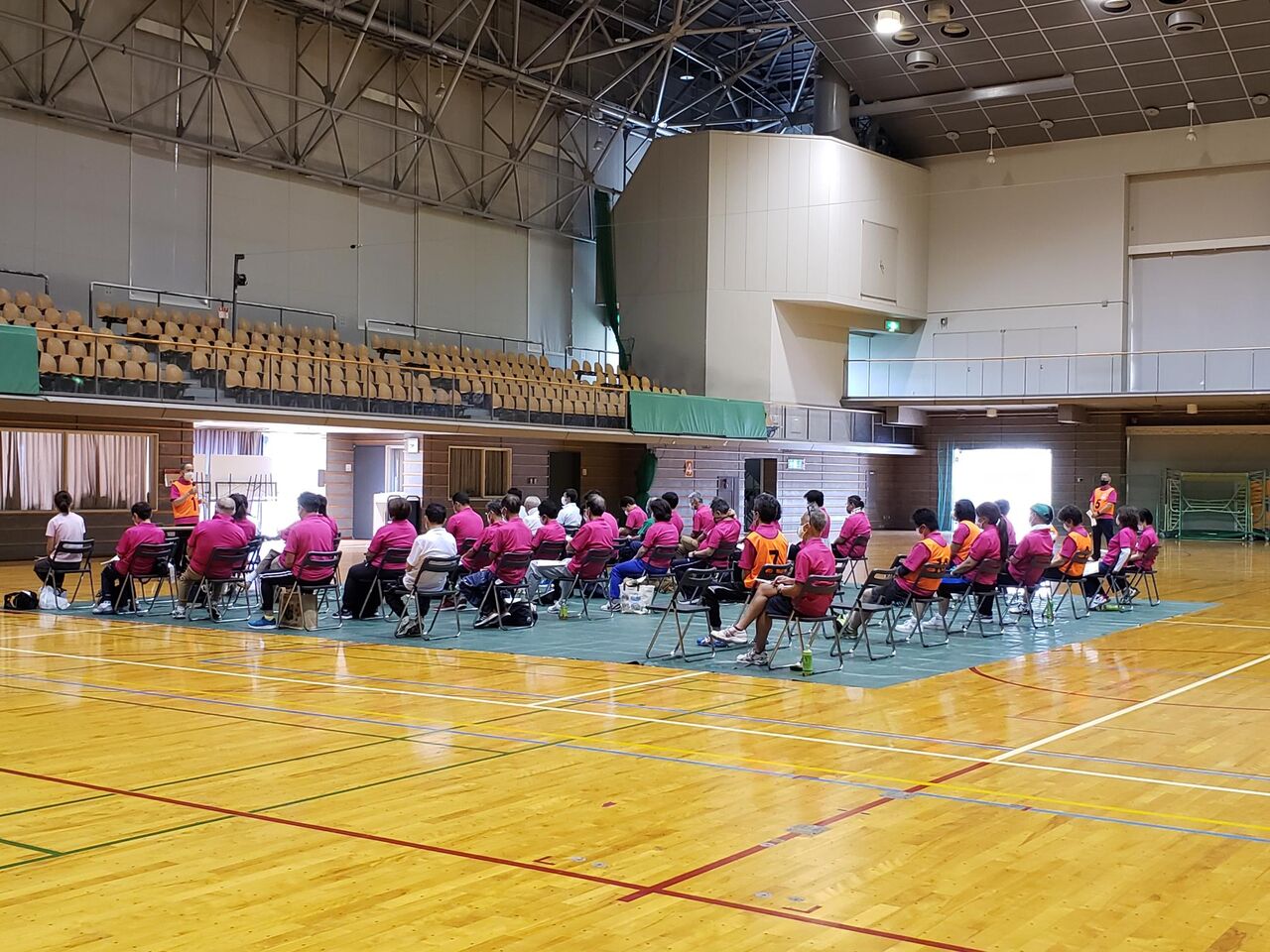 2022年07月08日 初任者研修 初任者研修 6月12日(日)秩父宮記念体育館に於いて新旧のスポーツ推進委員約60名の参加で感染対策をとりながら初任者研修会が開催されました。 第1部として川口会長より新任推進委員への期待と心構えの講話、第2部としてラジオ体操の実技を受講しました。実技指導者として、みらい創造財団の沼田氏を迎え、まずラジオ体操の歴史、効果、7つの部位への運動の説明を受講、その後一つ一つの実技を熱心に研修参加者へ指導していただきました。最後に「The Taiso/みんなの体操」の紹介と実技指導がありました。9時から始まった研修会は12時には終了し片づけをして解散しました。